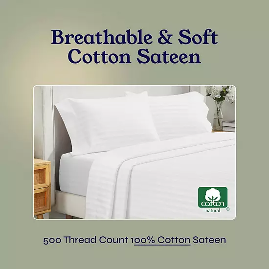 - Certified 500-thread count – 100% cotton sateen sheets with an elegant damask stripe pattern. Lightweight, airy, and breathable sheets designed for cool, comfortable sleep year-round.