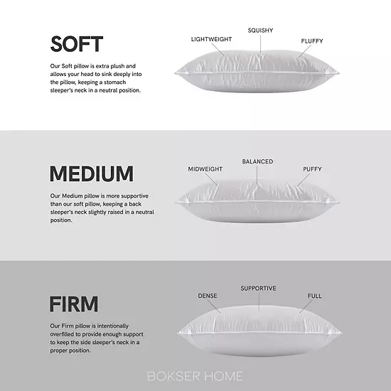 Wake up refreshed and energized with BOKSER HOME’s Luxury Duck Down Pillows. Filled with 700 fill power premium white duck down, BOKSER HOME pillows are encompassed in a 100% super soft cotton sateen shell. The firm density pillows offer a light, yet supportive, feel – perfect for side sleepers. Filled with 90% premium white duck down and 10% duck feather, the support of the BOKSER Firm Down Pillow allows a side sleeper’s head to rest comfortably on the pillow to keep the neck in a neutral position. Machine washable and dryable, the BOKSER HOME Firm Down Bed Pillow is the perfect way to add luxury to your bed. Standard Fill Weight: 28 oz King Fill Weight: 36 oz We use premium white duck down and feathers in all BOKSER HOME products due to the extraordinary warmth-to-weight ratio. Our down and feather manufacturing process includes multiple wash cycles to remove any impurities and ensure cleanliness. All BOKSER down products are independently tested and proudly certified by the Responsible Down Standard. The RDS guarantees the ethical sourcing of our products by respecting the animal-welfare practices in down and feather production, from the farm to the final product. We started BOKSER HOME to help more people love their bedding. We create home decor that is beautiful, responsibly sourced, and affordable. Our goal is to make the highest quality bedding at the lowest possible price.
