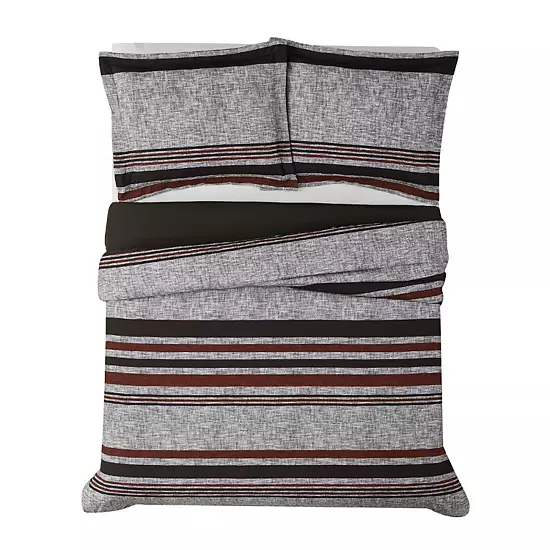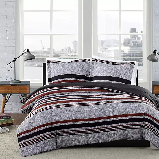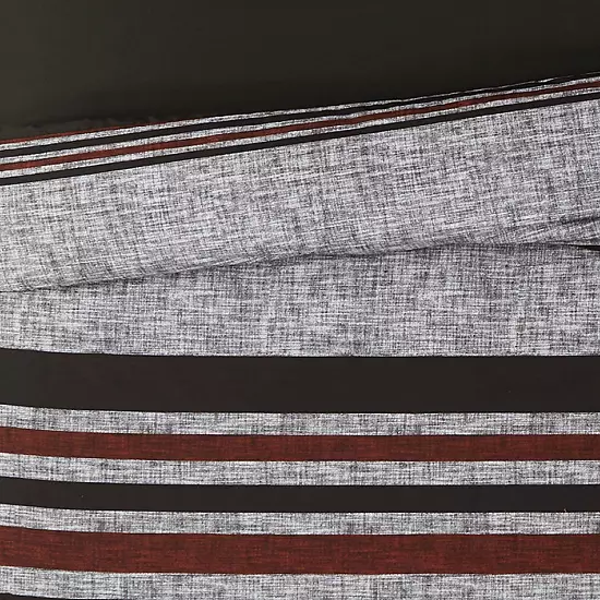 - This bed features a linen texture print in deep charcoal shades combined with black and deep red horizontal stripes making a dramatic statement in your bedroom.