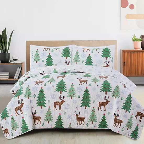 Easily add a fresh look to your existing bed with this stylish and timeless Madelinen Holly Collection Christmas Quilt Set with Shams.