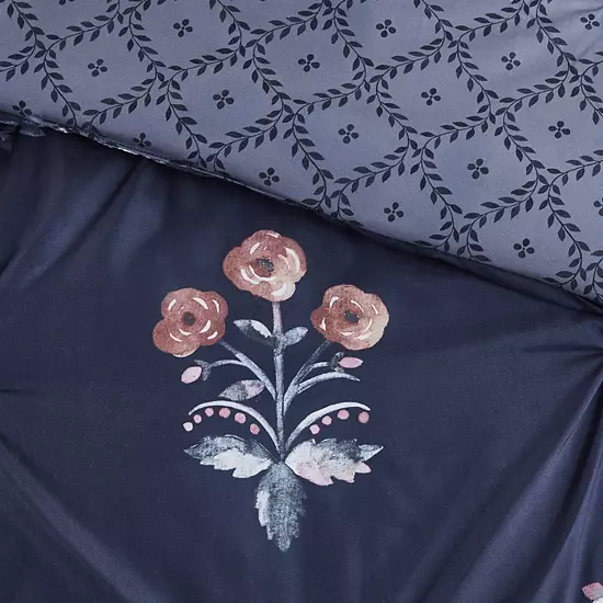 - Modern Farmhouse style featuring all over pintuck technique and floral motif in shades of peach, blush, red, teal, and white