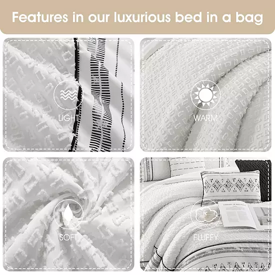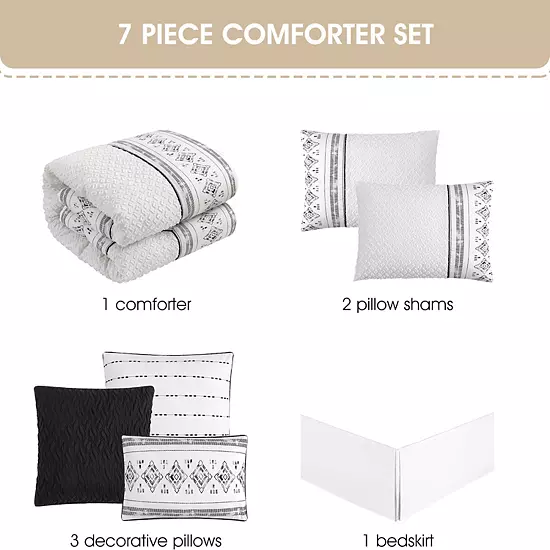 - 7-piece set includes: 1 comforter, 2 pillow shams, 1 bedskirt, 3 decorative pillows
