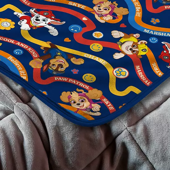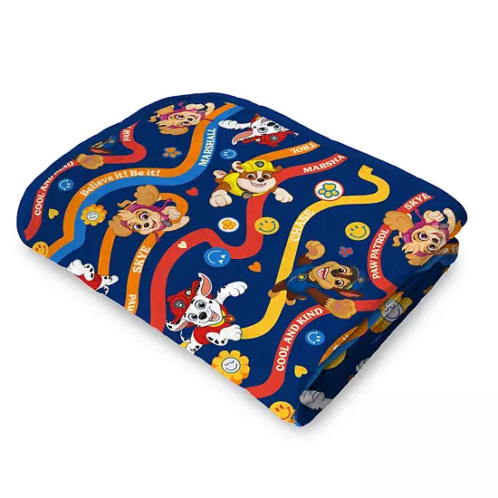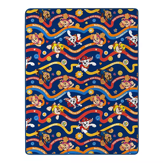 - Featuring a repeating pattern of Chase, Skye, Marshall, and Rubble alongside colorful wavy banners, smiley faces, hearts, and playful affirmations like “Believe it! Be it!” and “Cool and Kind.”