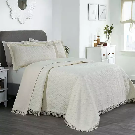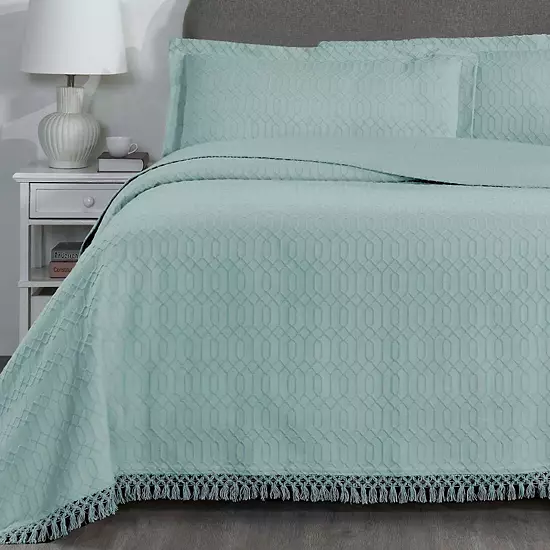 Complete your room with this SUPERIOR Remi Jacquard Woven Geometric Fringe Bedspread and Sham Set.