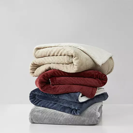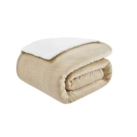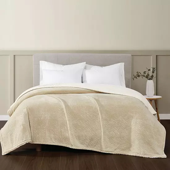 - The reverse side offers a solid off-white color in soft, cozy sherpa fleece fabric, ensuring warmth and comfort
