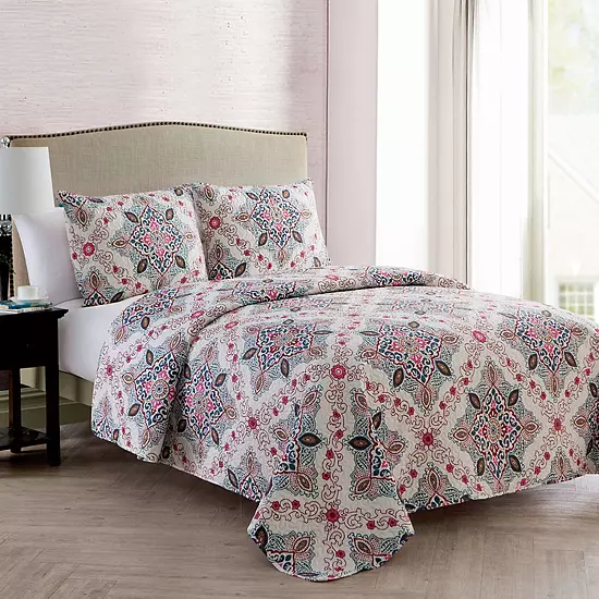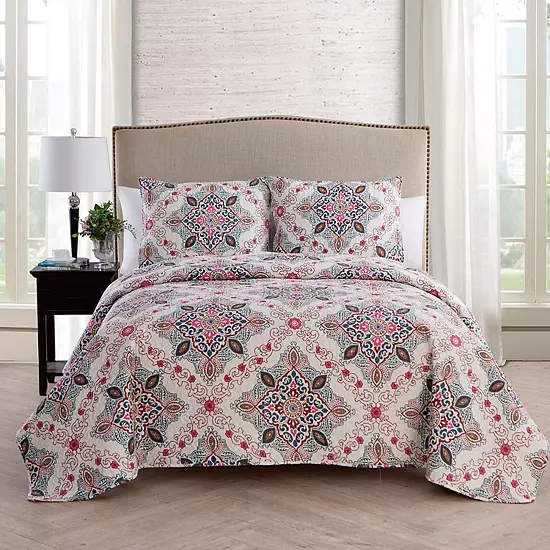 Designed to give your bedroom a pop of color, the Wyndham medallion quilt set features intricately-detailed medallions.