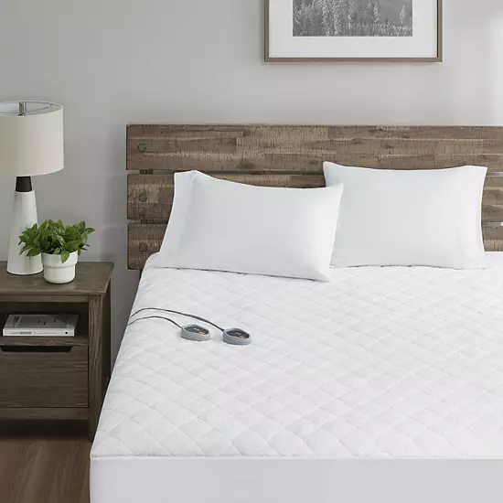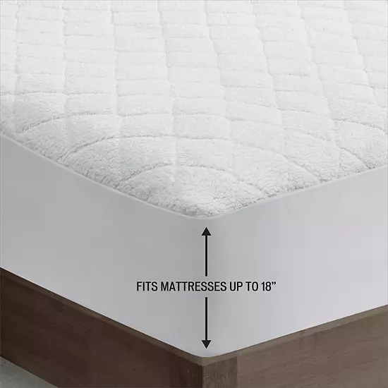 Never go to bed with cold sheets thanks to this cozy Woolrich Heated sherpa mattress pad. In white.