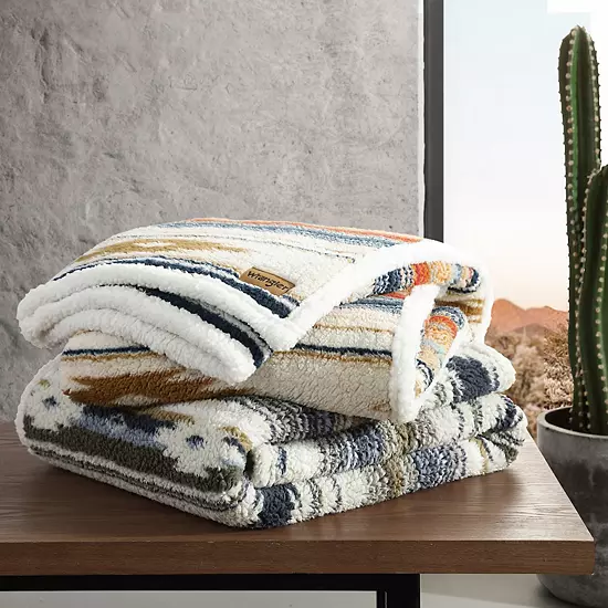 Cozy up in comfortable warmth and authentic Wrangler style with this Wrangler Coyote Sands Beige Reversible Throw Blanket.